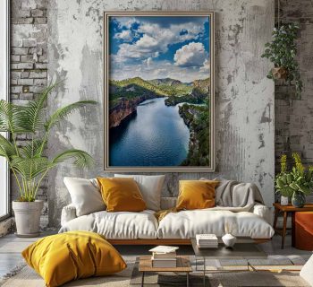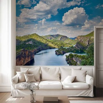 Photo taken from the Bolarque Reservoir Viewpoint at midday in June with a stunning sky filled with large clouds and a deep horizon. Add light and color to your favorite spot or project!