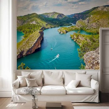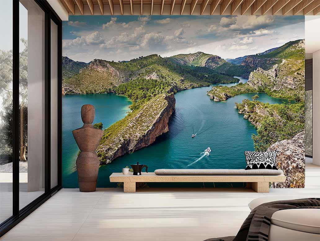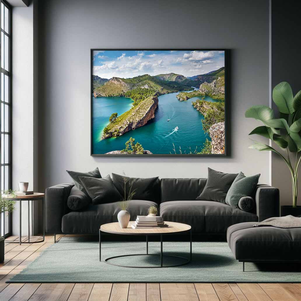 Bolarque Reservoir from the viewpoint, with a stunning sky filled with large clouds and a deep horizon. Add light and color to your favorite spot or project!