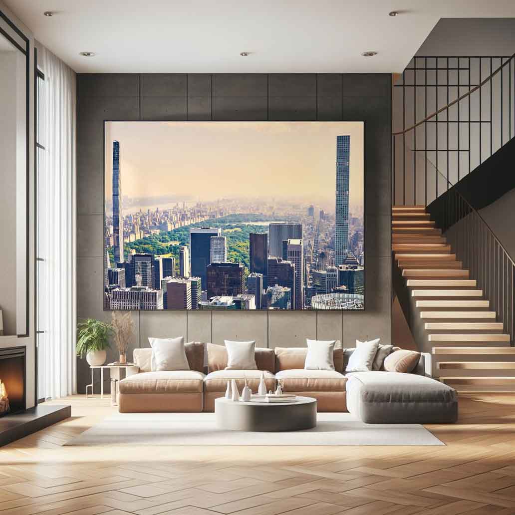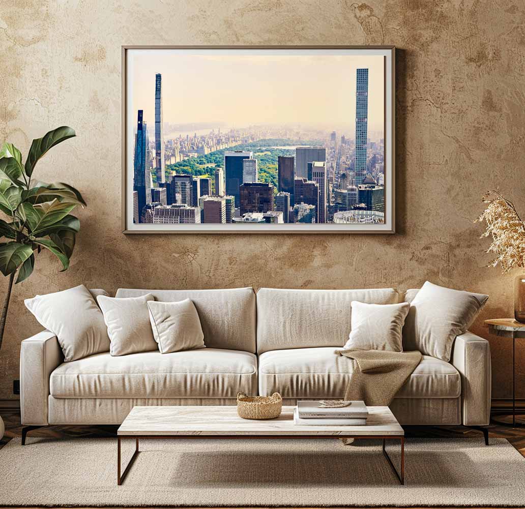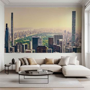 Stunning panoramic photograph of Central Park at sunset. Take in the expanse of the park, the Hudson River, and the Manhattan skyline bathed in haze and golden light. A high-resolution image perfect for large-format decoration!