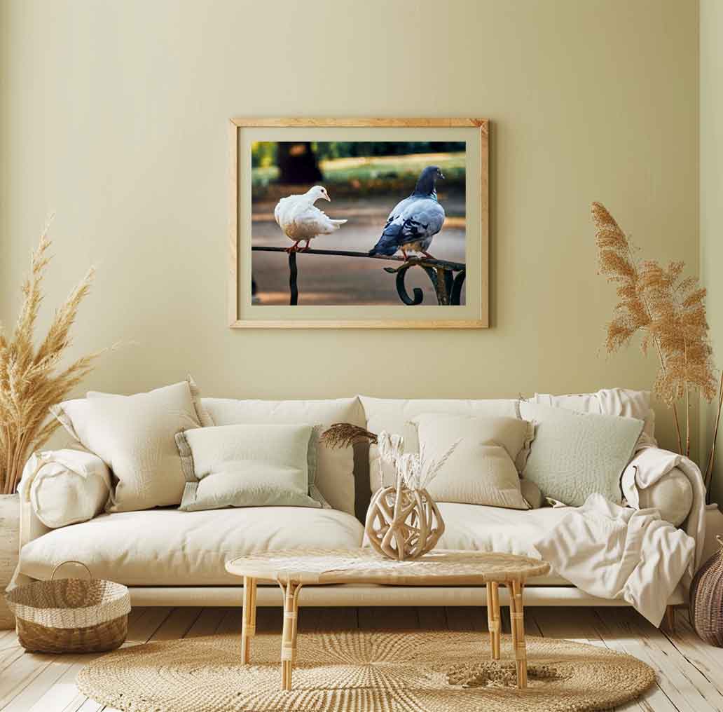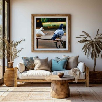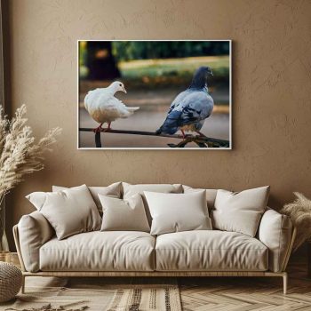 Witness an intimate moment in nature: a male pigeon stands impassively while the female appears to show affection. A courtship scene perfect for your project or favorite space.