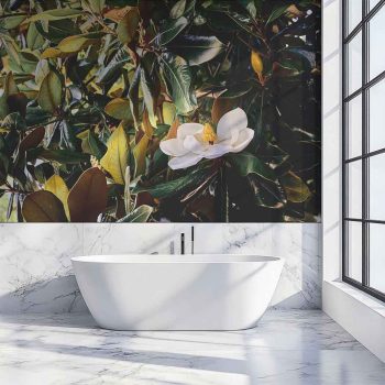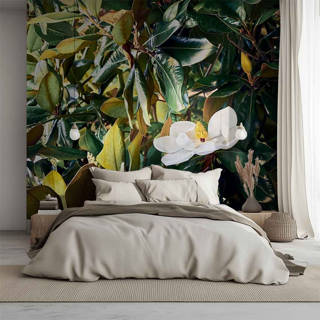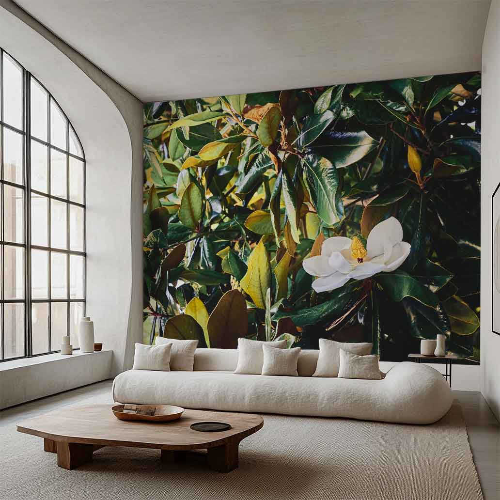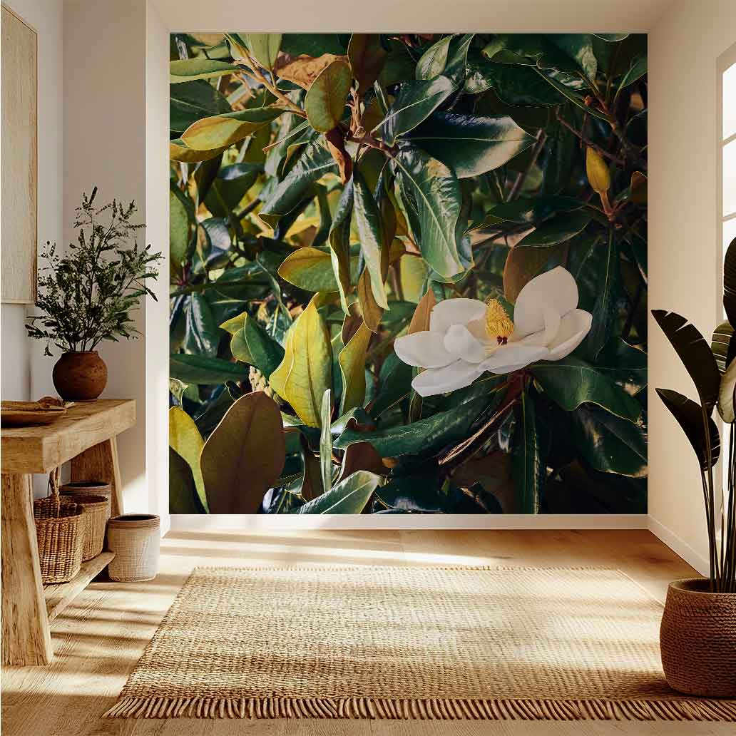 This fine art photography piece is a detailed study of a magnolia flower, captured in all its splendor. The framing highlights the texture of the foliage and the interplay of light and shadow, creating a piece of great visual depth.
