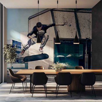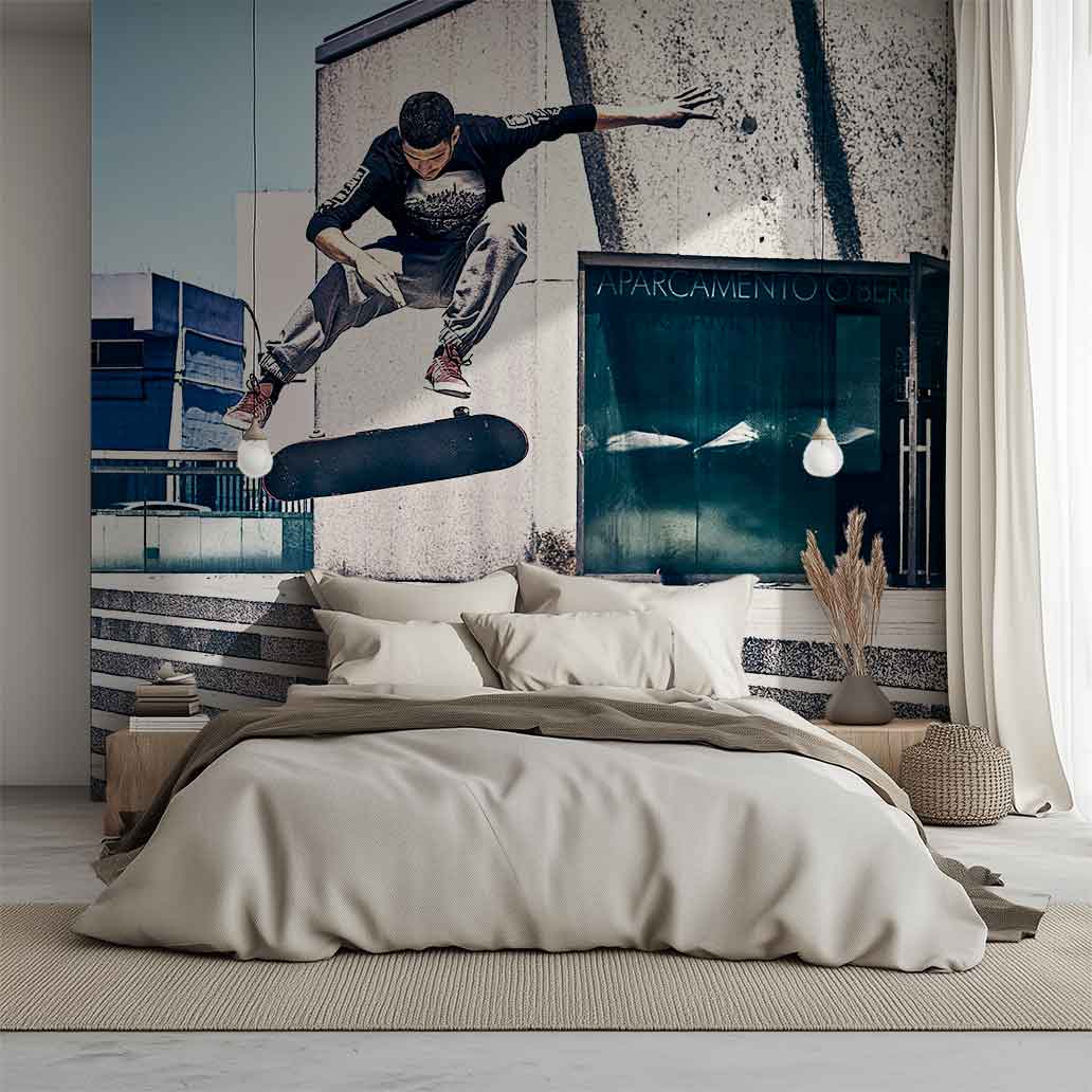 Feel the adrenaline of risk and the precision of mastery. This artistic photograph captures the mastery of a skater in mid-flight, a moment of pure challenge and balance. Ideal for sports and adventure lovers.