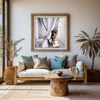 A safe and stylish haven: this pup hides in his owner’s lap, wearing iconic Converse All Stars. Add this sweet photo to your collection, favorite spot, or decorating project.