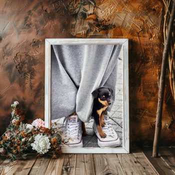 The puppy’s innocence and the urban touch of his owner’s Converse All Star sneakers in a charming photograph. A scene that captures an adorable moment of protection with a fashionable twist!