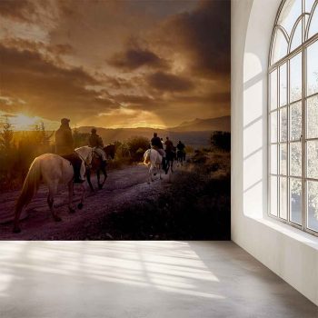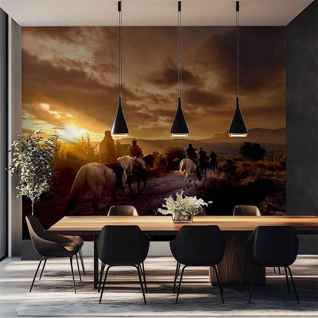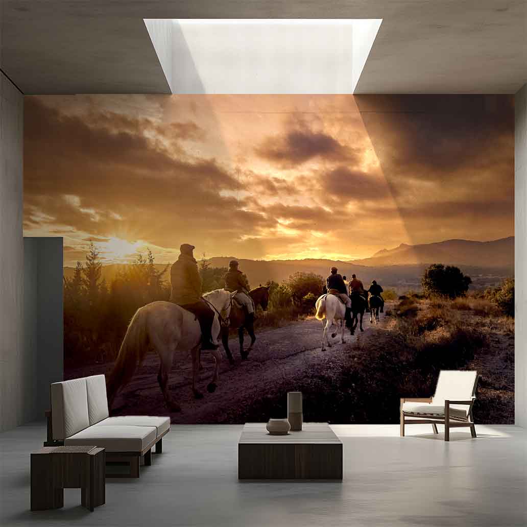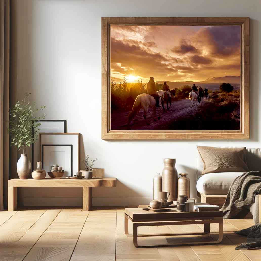Discover the bucolic beauty of this timeless scene, where a large orange sun illuminates a vast meadow at sunset. Riders and horses, enveloped in the golden light, advance with a serene movement, creating perfect silhouettes against a vibrant orange sky. Captured as the riders walk by, this landscape photograph conveys a profound sense of peace and harmony. Ideal for nature photography lovers and those looking for Zen-like decor or sunset landscape murals.
