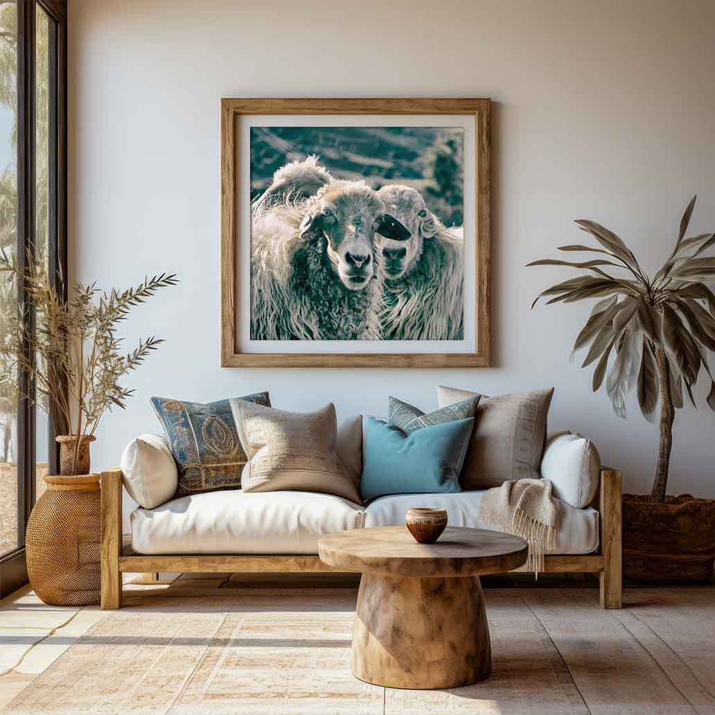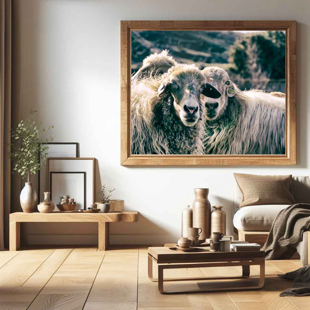 The countryside comes alive with ‘Sheep Tending the Flock’. This photograph captures a moment where two sheep stare straight into the camera, their expressions somewhere between intrigue and warning. Rural character in every detail!