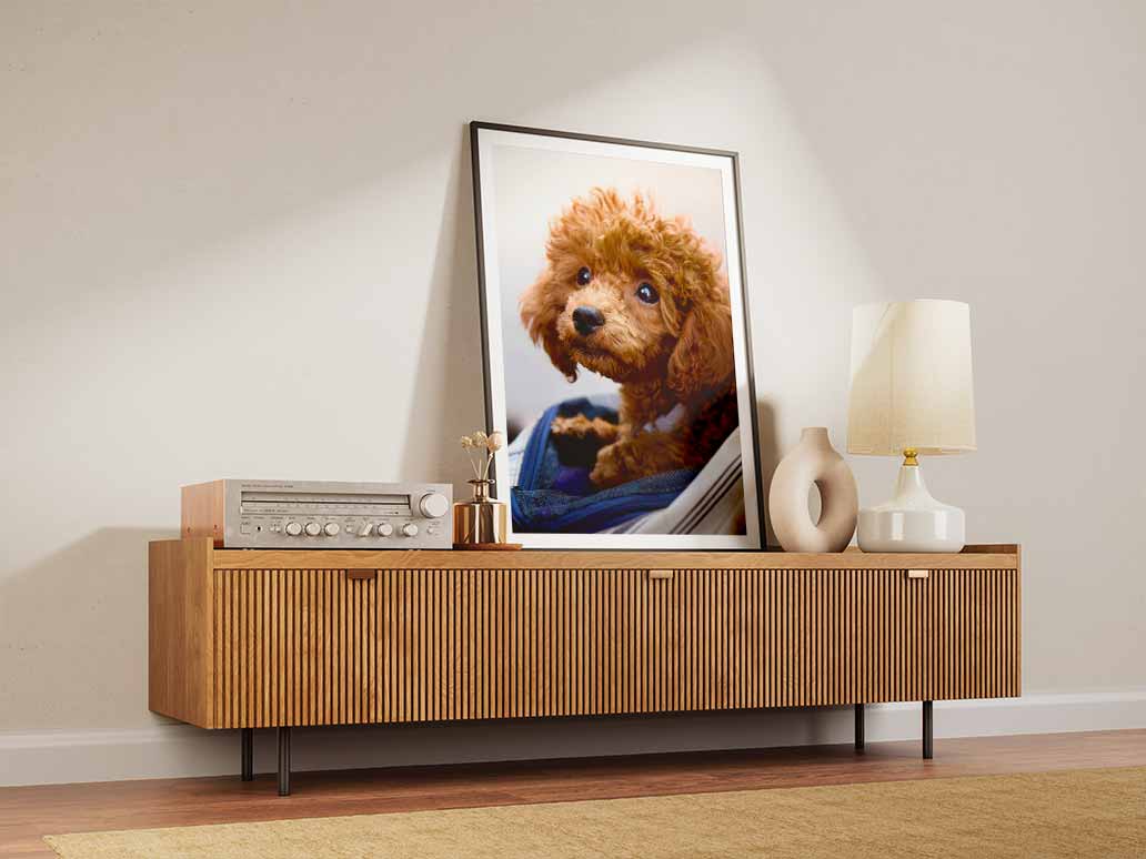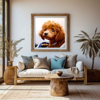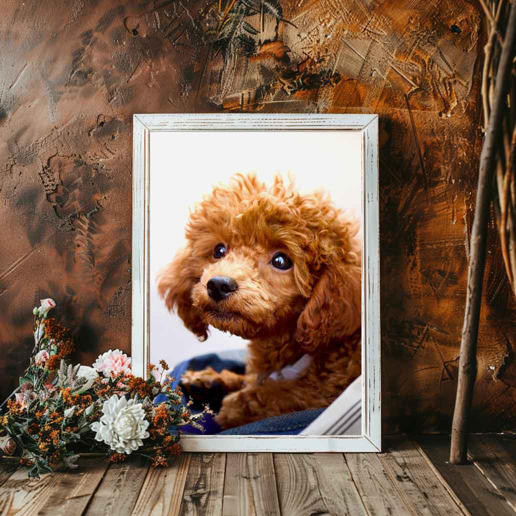 A red poodle looks tenderly at its owner. Photograph of an adorable toy poodle showing affection. A sweet look for your favorite room.