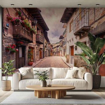 Experience the calm of a Castilian sunset. This street photography captures a deserted cobblestone street and flowers on balconies, all bathed in warm tones. Ideal for home decor and rural projects.