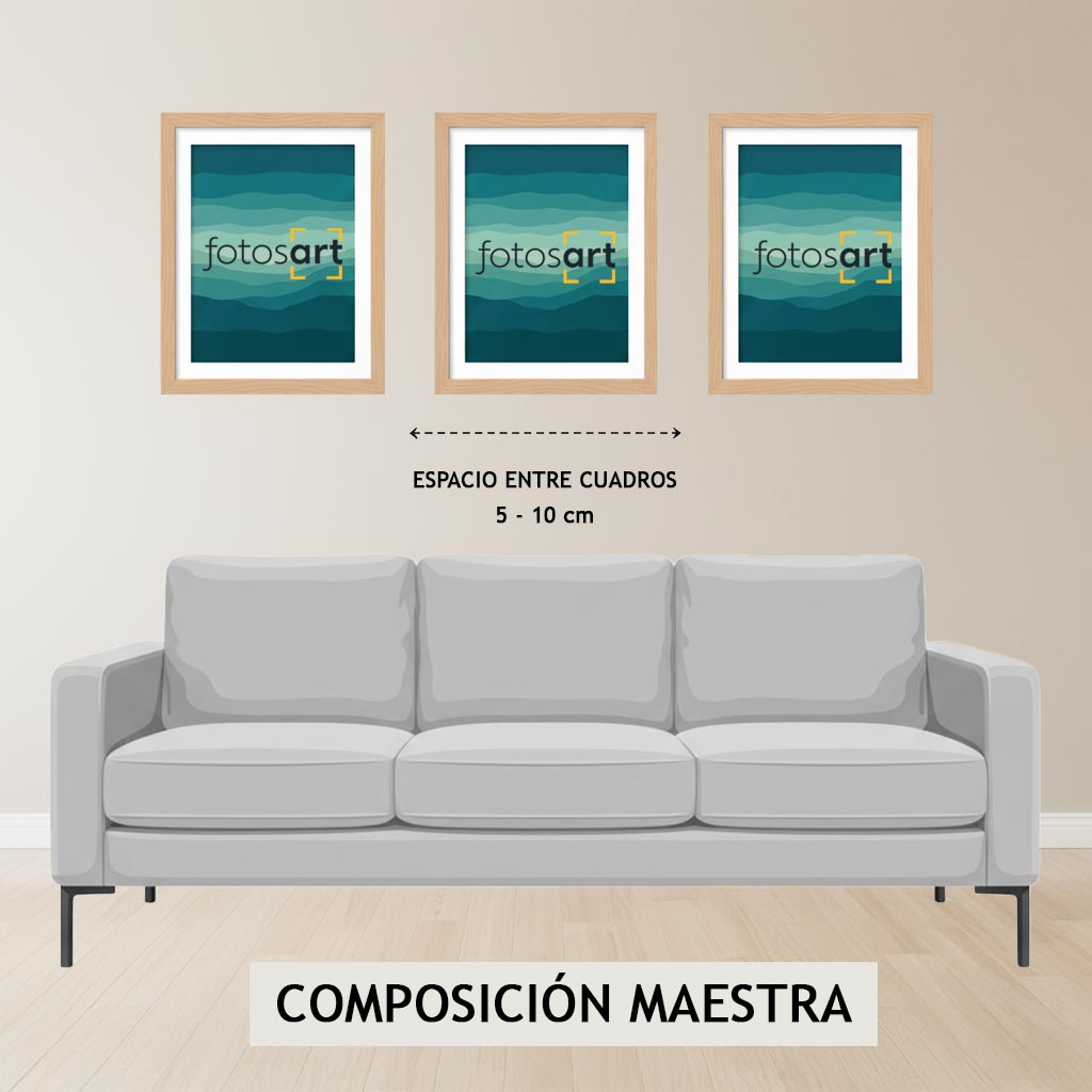 • Expert Recommendation: I recommend leaving a space of 5 to 10 centimeters (maximum) between the formats. This space is crucial; it acts as a visual pause that allows the eyes to move smoothly between the pieces, maintaining compositional unity.