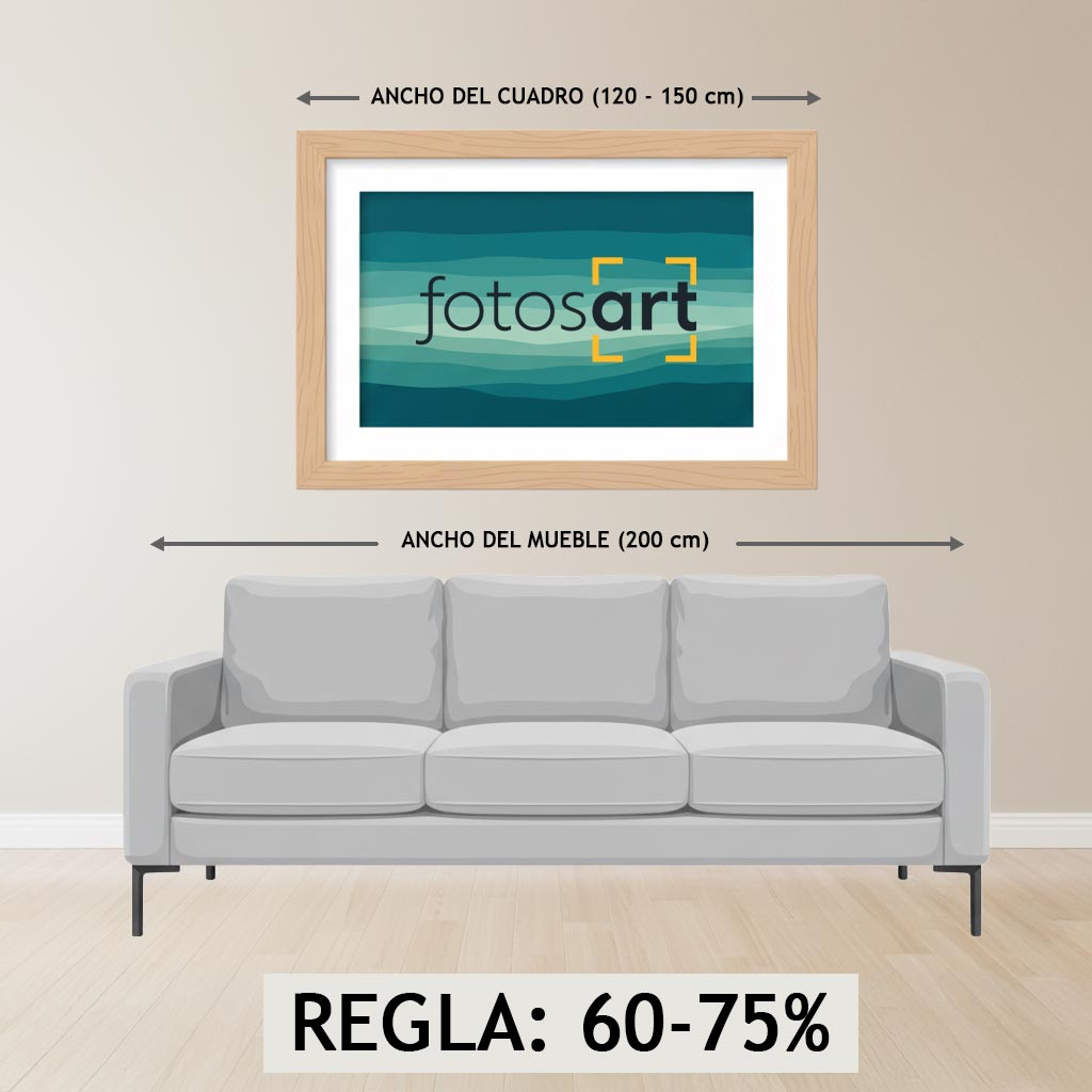 When you are going to place your artwork above a main piece of furniture — such as the living room sofa, the fireplace, the hall furniture or the headboard of the bed —, the width of your painting should (ideally) occupy between 60% and 75% of the width of the furniture below it.