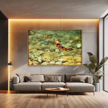 Colorida escena de unas carpas Koi nadando en libertad. Esta fotografía impresa queda preciosa en cualquier tamaño, incluso para cubrir paredes.