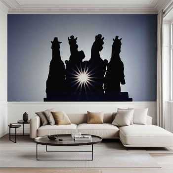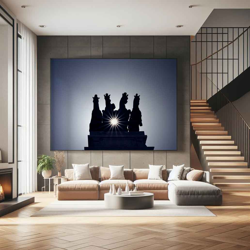 Un amanecer épico sobre Madrid: fotografía de las Cuadrigas del edificio BBVA en contraluz. El sol, con su marcado efecto estrella, muestra la silueta de esta escultura monumental. ¡Arte y luz!»