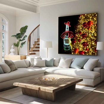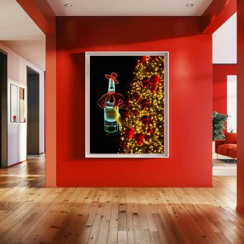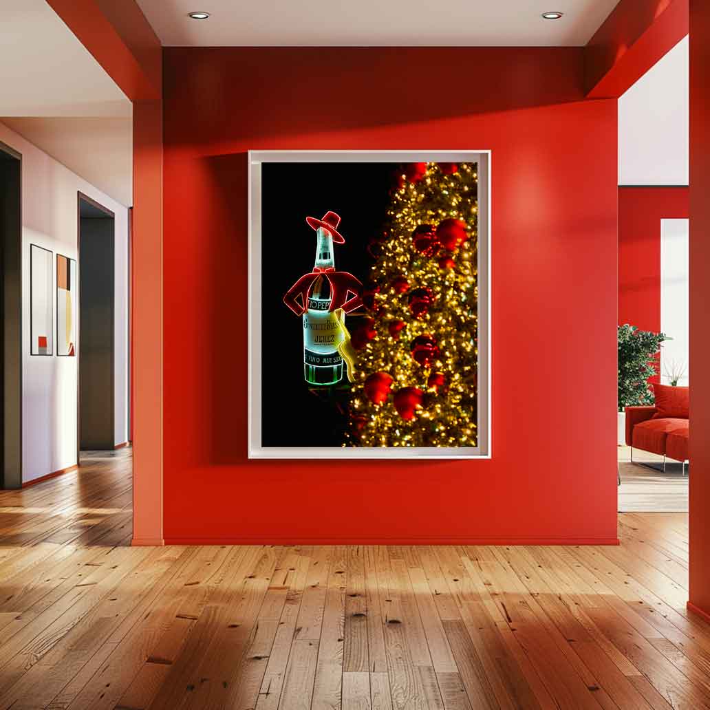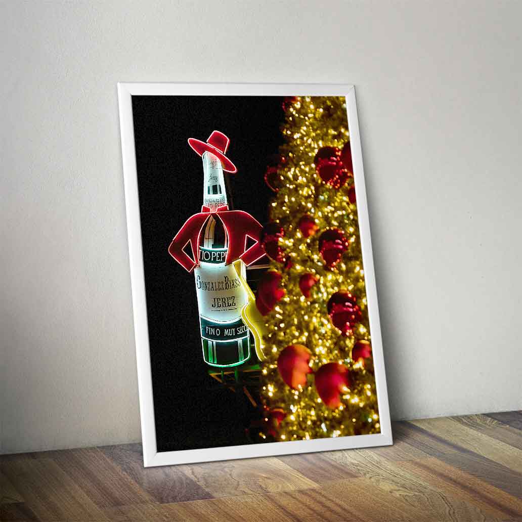 En esta fotografía he querido capturar la esencia nocturna de la capital durante las fiestas. El icónico cartel de Tío Pepe se muestra con orgullo iluminando la noche en la plaza, recortado sobre un fondo negro profundo que resalta sus colores vibrantes. En primer plano, las luces y bolas del árbol de Navidad en tonos dorados aparecen desenfocadas, creando un marco cálido que aporta profundidad y una atmósfera mágica a la escena. Es una visión personal de un símbolo que define a Madrid, transformada en una pieza de Fine Art para tu colección.