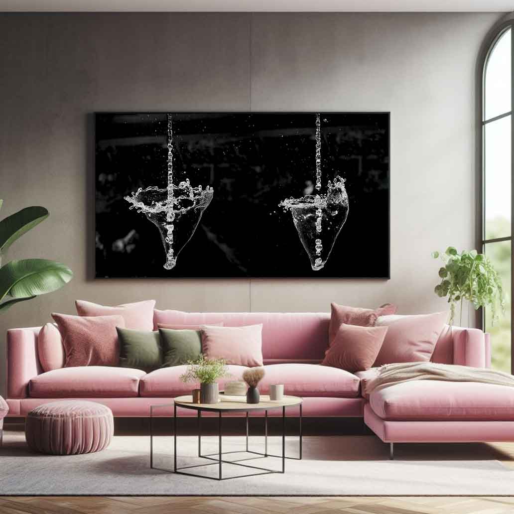 Sumérgete en el juego de las formas del agua. Esta fotografía artística en blanco y negro presenta chorros de agua invertidos que crea una imagen hipnótica y llena de intriga. Ideal para ambientes modernos. ¡Inspira tu mente!