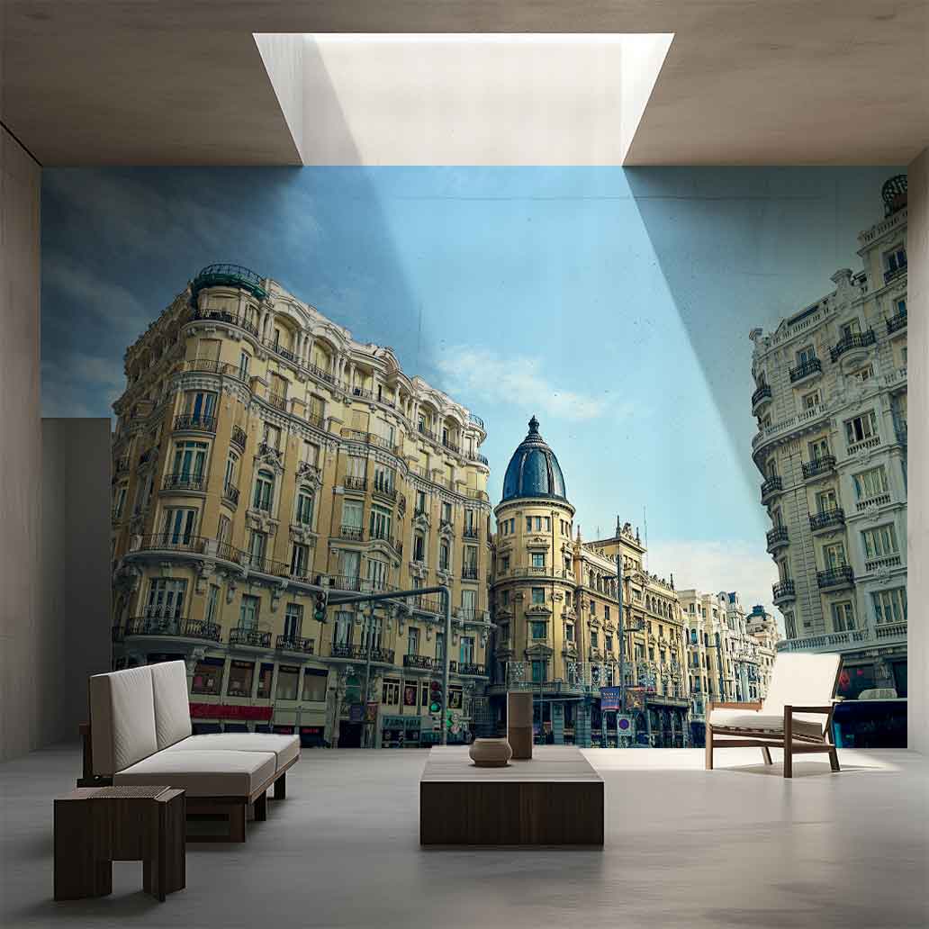Una vista imprescindible del «Broadway madrileño» que captura la monumentalidad de sus fachadas históricas bajo un intenso cielo azul. La fotografía se centra en la arquitectura ecléctica del primer tramo de la Gran Vía, destacando la elegancia señorial del edificio del número 22 y la icónica cúpula de pizarra del Círculo Gran Peña al fondo.