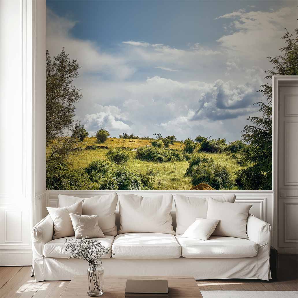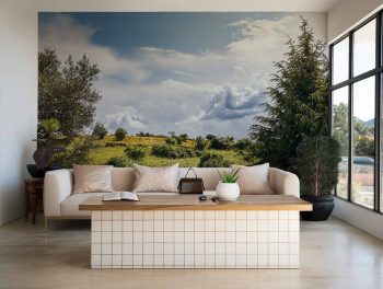 • Paisaje de un verde campo, cielo azul y grandes nubes blancas