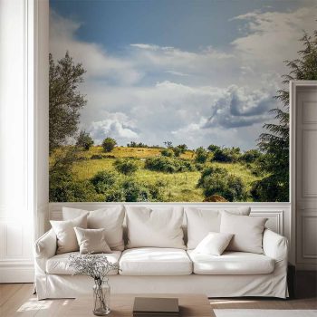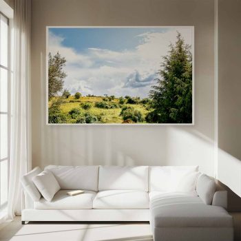 Paisaje del Atazar una tarde de primavera. Fotografía de paisaje con cielo iluminado, nubes blancas y una verde pradera. Luz, naturaleza y paz para un rincón de tu casa.