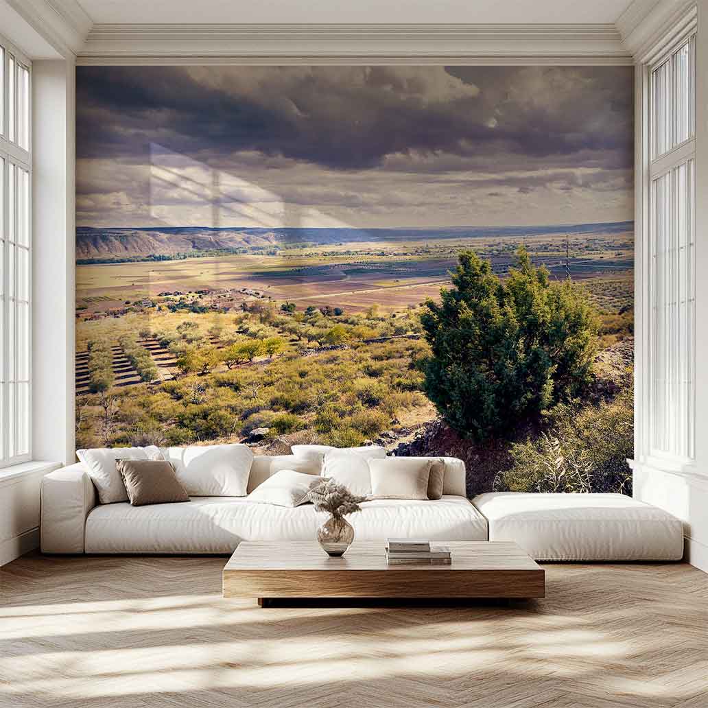Descarga esta panorámica del Valle del Jarama (Madrid). Fotografía de paisaje con cielo nublado y gran profundidad. Activo digital en alta resolución ideal para decoración y uso editorial.