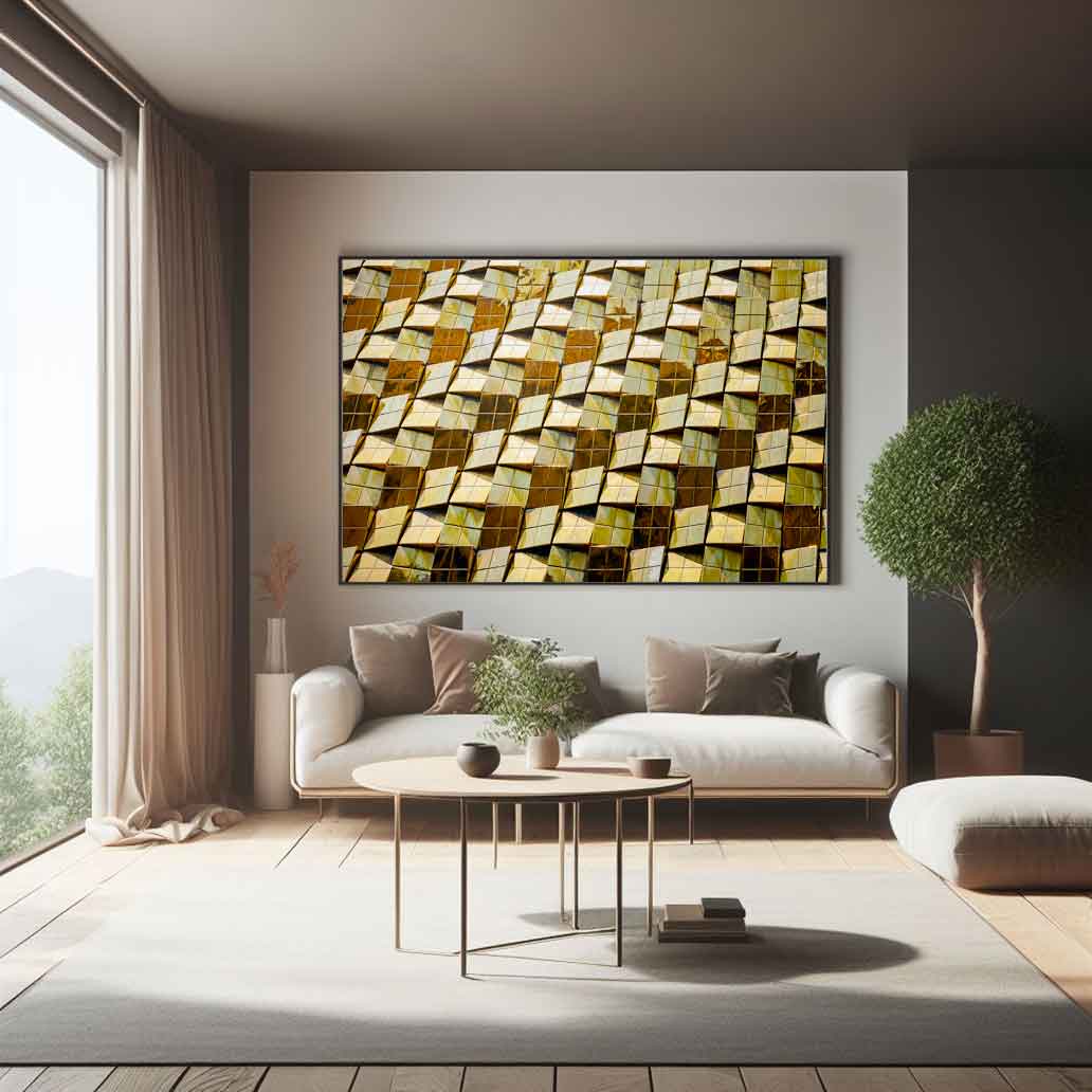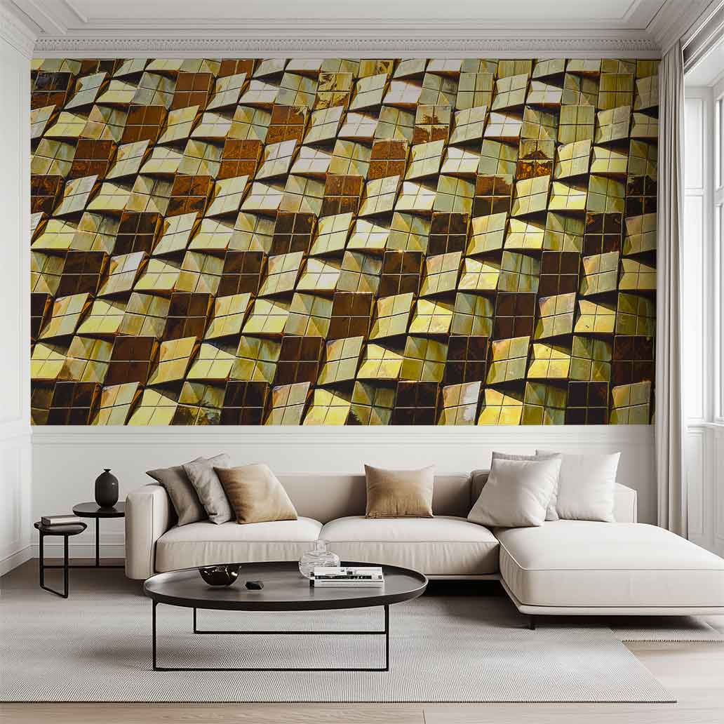 • Pared de cubos dorados que reflejan la luz