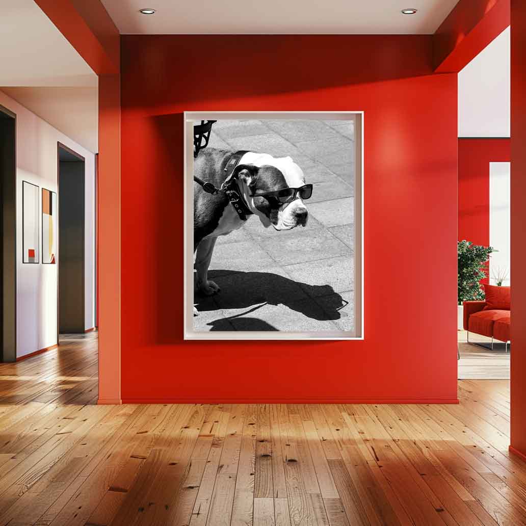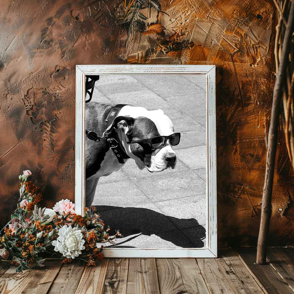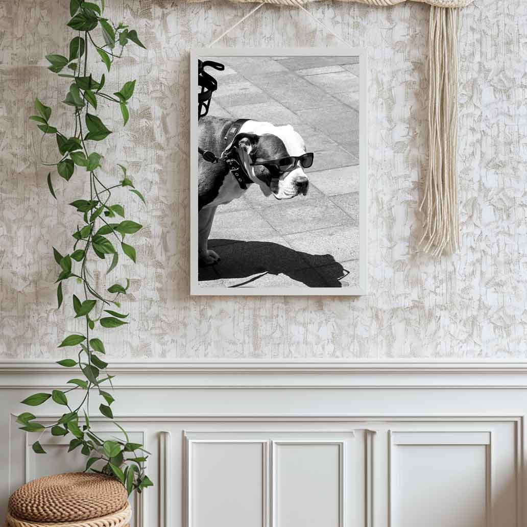 Fotografía de un perro llevando gafas de sol para proteger sus ojos de la intensa luz del sol del mediodía. ¡Una escena original y divertida! Úsala en tu proyecto o espacio favorito.