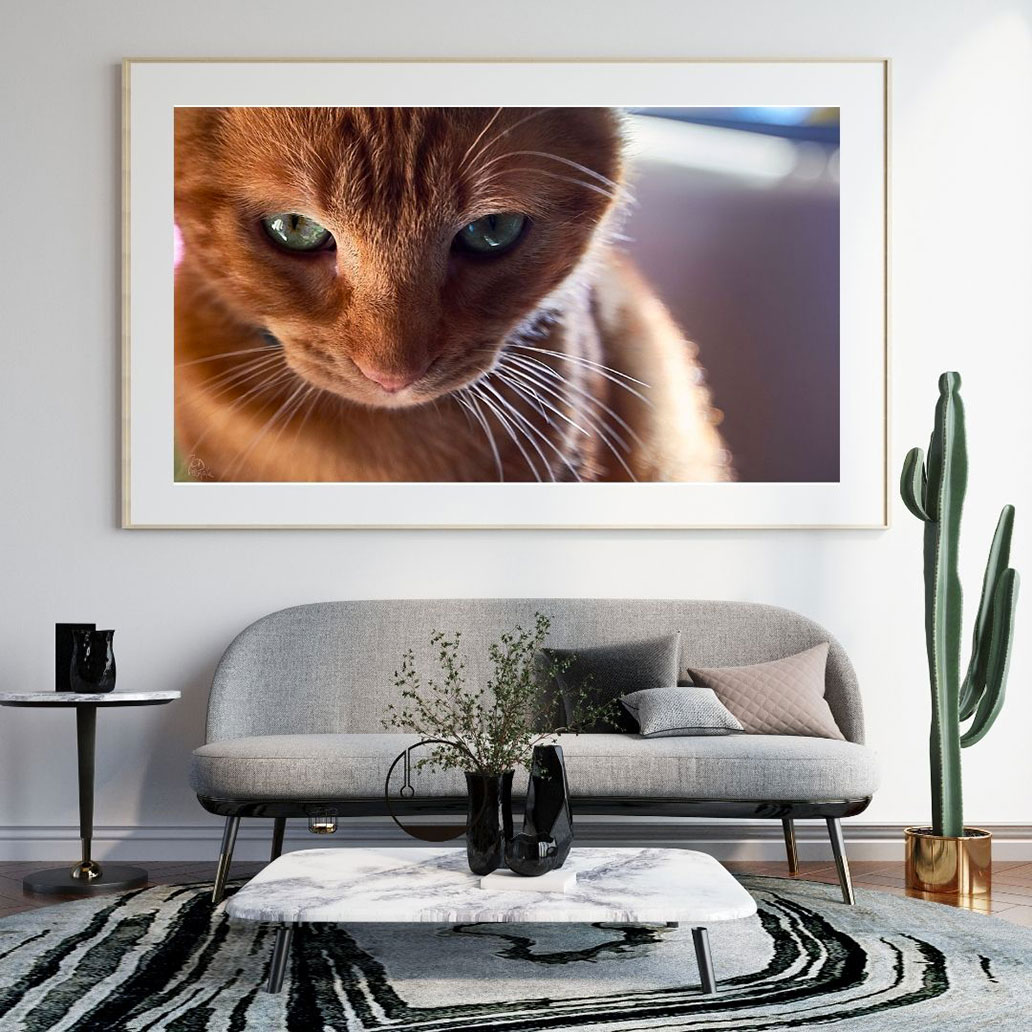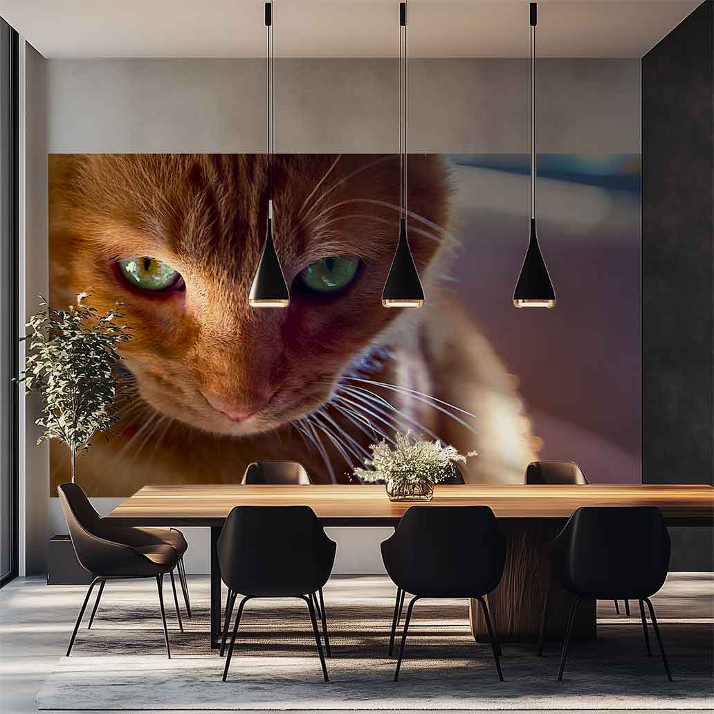 Déjate cautivar por la mirada enigmática de Zeus, este gato pelirrojo. Con sus grandes ojos verdes, su expresión oscila entre el interés y el desafío. Una fotografía que no te dejará indiferente.