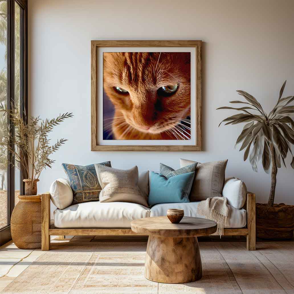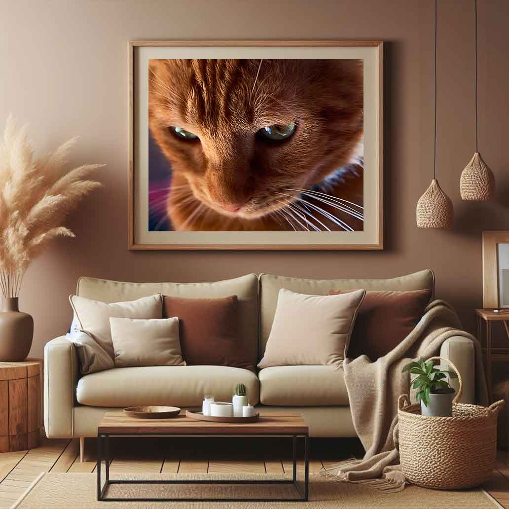 Descubre el misterio en los ojos de este gato pelirrojo. Una fotografía en primer plano que captura una mirada hipnótica y ambigua, llena de interés o quizás perdida en el pensamiento. ¡Belleza felina con personalidad!